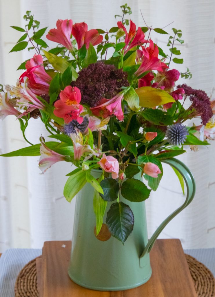 Ann Belcher has kindly provided this photo of an arrangement that she made in the last day or two with all materials sourced from her garden – amazing what good things our gardens offer even at this time of year. Thank you Ann.
